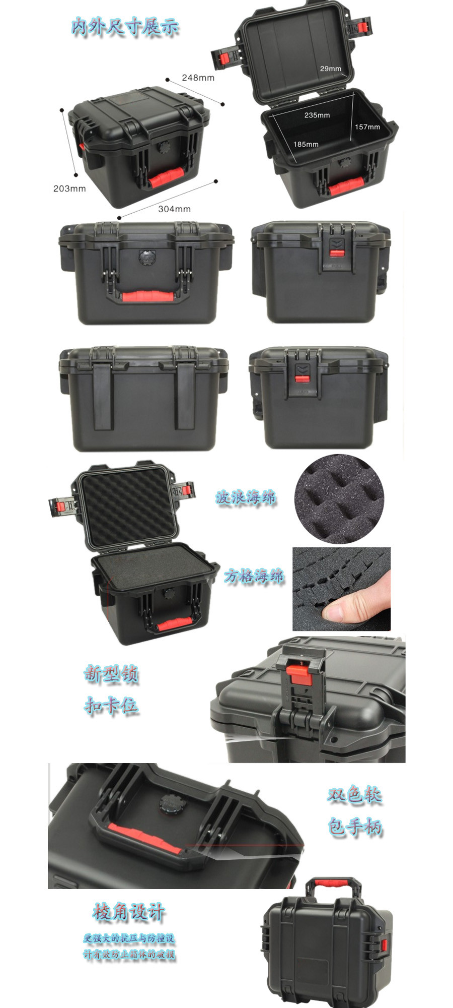 簡要說明:廣泛用于傳媒、公安、消防、軍隊、航空、戶外攝影、野外考察、科學探測等眾多領域的高端儀器、儀表。具有高強度、高抗壓沖擊、防潮、絕對密封、防塵、防水等特點。產(chǎn)品材質:ABS原料,箱體采用高抗沖擊的高分子聚合材料一體注塑成型,密封采用扁型彈性發(fā)泡密封橡膠條,確保防水氣密,所有較軸均采用不銹鋼材質。