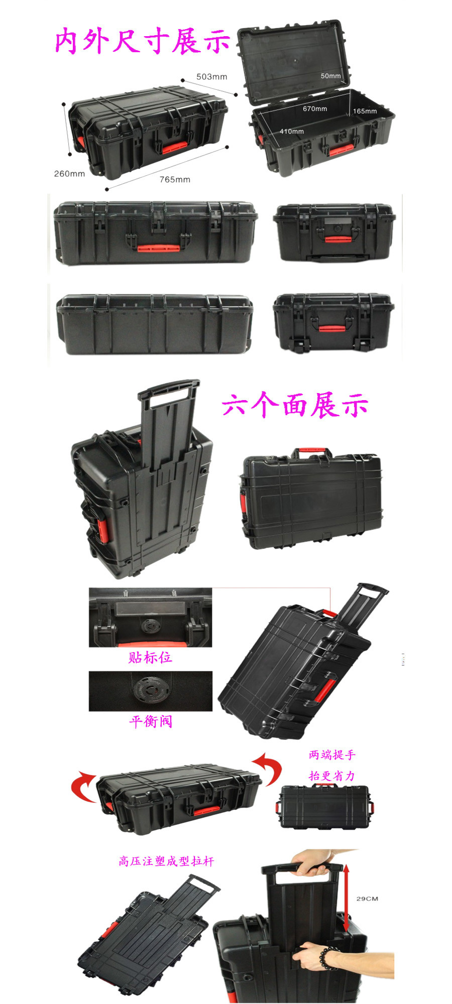 簡(jiǎn)要說(shuō)明:廣泛用于傳媒、公安、消防、軍隊(duì)、航空、戶(hù)外攝影、野外考察、科學(xué)探測(cè)等眾多領(lǐng)域的高端儀器、儀表。具有高強(qiáng)度、高抗壓沖擊、防潮、絕對(duì)密封、防塵、防水等特點(diǎn)。產(chǎn)品材質(zhì):ABS原料,箱體采用高抗沖擊的高分子聚合材料一體注塑成型,密封采用扁型彈性發(fā)泡密封橡膠條,確保防水氣密,所有較軸均采用不銹鋼材質(zhì)。
